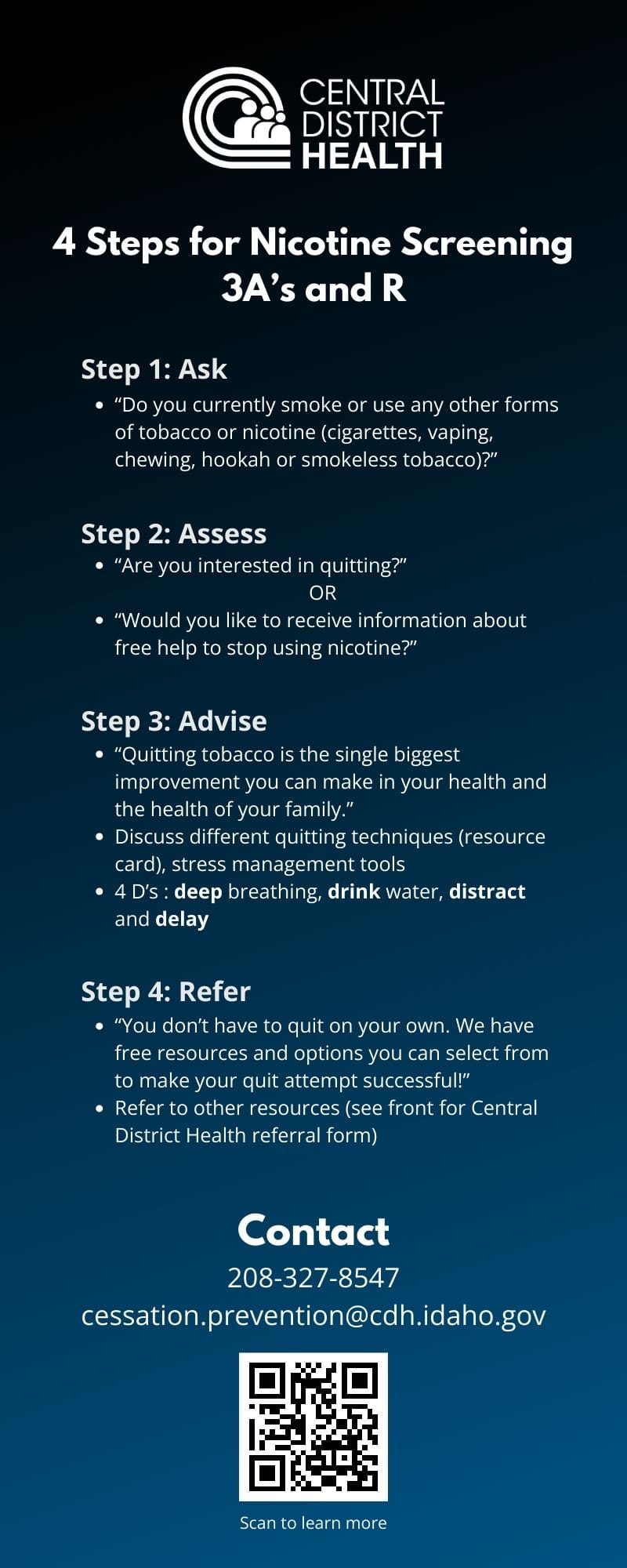 If you require more than 25 cards, please contact the Tobacco and Vaping Prevention and Cessation Program at cessation.prevention@cdh.idaho.gov.